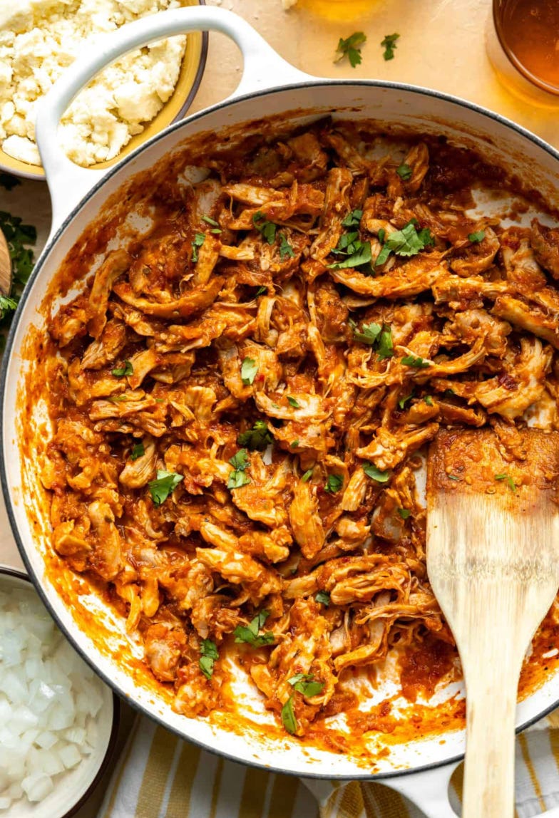 Return shredded chicken to the pot and stir to coat. Simmer uncovered until the sauce thickens and clings to the chicken. Season with salt, pepper, and additional vinegar or lime juice to taste.